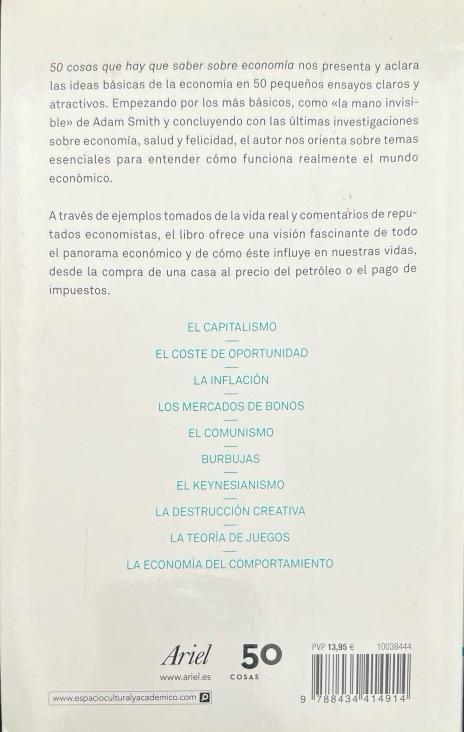 50 cosas que hay que saber sobre economía nos presenta y aclara las ideas básicas de la economía en 50 pequeños ensayos claros y atractivos. Empezando por los más básicos, como “la mano invisible” de Adam Smith y concluyendo con las últimas investigaciones sobre economía, salud y felicidad, el autor nos orienta sobre temas esenciales para entender cómo funciona realmente el mundo económico.