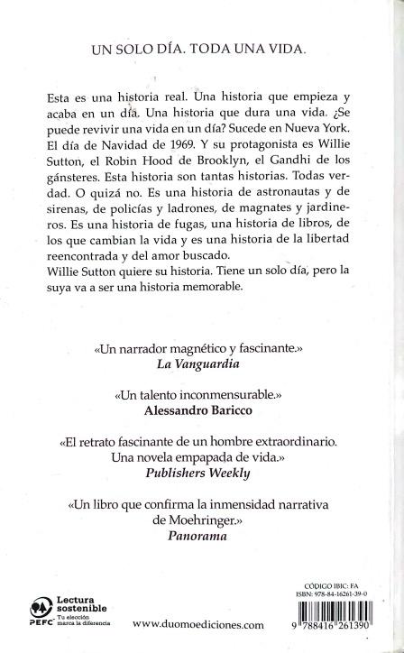 Esta es una historia real. Una historia que empieza y acaba en un día. Una historia que dura una vida. ¿Se puede revivir una vida en un día? Sucede en Nueva York. El día de Navidad de 1969. Y su protagonista es Willie sutton, el Robin Hood de Brooklyn, el Gandhi de los gánsteres. Esta historia son tantas historias. Todas verdad. O quizá no. Es una historia de astronautas y de sirenas, de policial y ladrones, de magnates y jardineros. Es una historia de fugas, una historia de libros, de los que cambia la vida y es una historia de la libertad encontrado y del amor buscado. Willie sutton quiere su historia. Tiene un solo día, pero la suya va a ser una historia memorable.