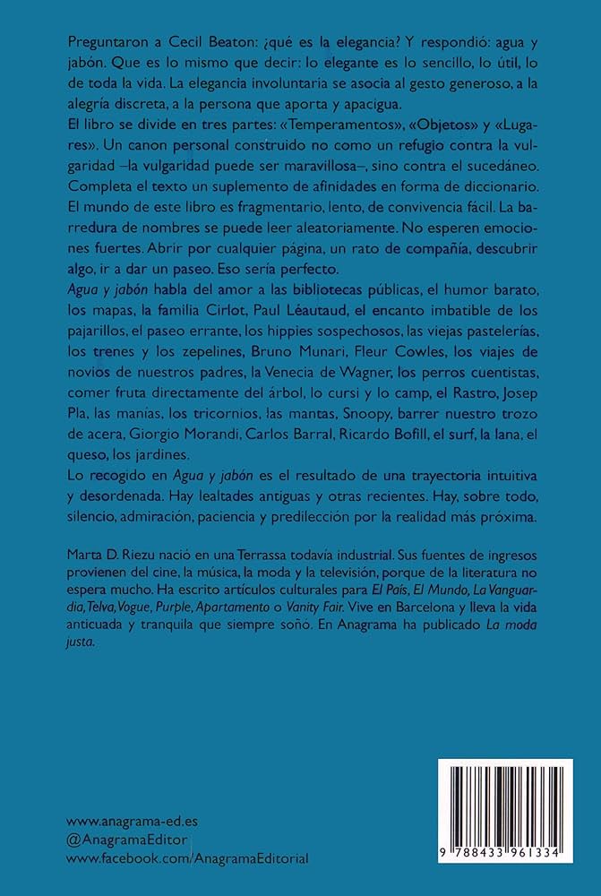Agua y jabón habla del amor a las bibliotecas públicas, el humor barato, los mapas, la familia Cirlot, Paul Léautaud, el encanto imbatible de los pajarillos, el paseo errante, los hippies sospechosos, las viejas pastelerías, los trenes y los zepelines, Bruno Munari, Fleur Cowles, los viajes de novios de nuestros padres, la Venecia de Wagner, los perros cuentistas, comer fruta directamente del árbol, lo cursi y lo camp, el Rastro, Josep Pla, las manías, los tricornios, las mantas, Snoopy, barrer nuestro trozo de acera, Giorgio Morandi, Carlos Barral, Ricardo Bofill, el surf, la lana, el queso, los jardines.