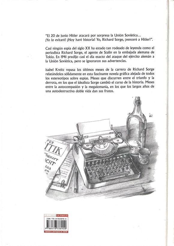 Isabel Kreitz repasa los últimos meses de la carrera de Richard Sorge relatándolos sólidamente en ésta fascinante novela gráfica alejada de todos los estereotipos sobre espías. Meses que discurren entre el triunfo y la derrota, en los que el idealista Sorge cambió el curso de la historia. Meses entre la autocompasión y la megalomanía, en los que los largos años de una autodestructiva doble vida dan sus frutos.