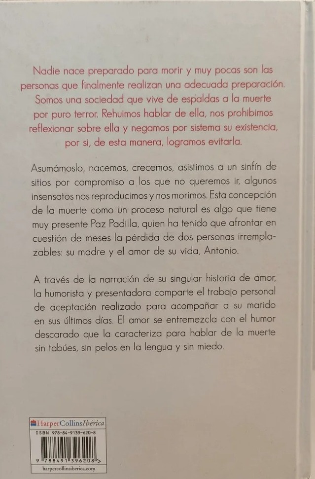 La vida de Paz Padilla ha estado siempre caracterizada por el humor y la alegría, pero sus últimas vivencias han sido todo lo contrario, pues se ha tenido que enfrentar a la muerte de su madre y su marido con solo cinco meses de diferencia. En este libro, Paz se sincera contando su verdadera historia de amor, el amor de su vida y como el destino ha querido truncar esta historia. Su marido, que había sido su primer novio en su juventud y con el que se había casado hacía realmente poco tiempo, sufrió un grave tumor cerebral y falleció. Paz cuenta con mucho humor y sinceridad como pudo superar la enfermedad de su compañero apoyándose en la alegría y las bromas y como, pese a la tristeza, sigue siendo feliz. Cuenta su experiencia con profesionales que le han ayudado a entender la muerte y a como despedirse en paz de un ser querido. Para ello esta siendo muy importante la psicología, la meditación y aprender a entender la muerte como algo natural.
