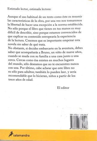 No obstante, si decides embarcarte en la aventura, debes saber que acompañarás a Bruno, un niño de nueve años, cuando se muda con su familia a una casa junto a una cerca. Cercas como ésa existen en muchos sitios del mundo, sólo deseamos que no te encuentres nunca con una. Por último, cabe aclarar que este libro no es sólo para adultos; también lo pueden leer, y sería recomendable que lo hicieran, niños a partir de los trece años de edad.
