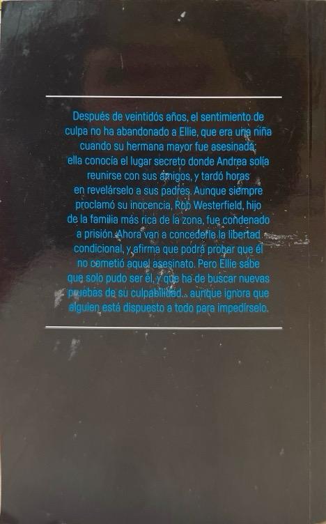 Después de veintidós años, el sentimiento de culpa no ha abandonado a Ellie, que era una niña cuando su hermana mayor fue asesinada: ella conocía el lugar secreto donde Andrea, su hermana, solía reunirse con sus amigos, y tardó horas en revelárselo a sus padres. Aunque siempre proclamó su inocencia, Rob Westerfield, hijo de la familia más rica de la zona, fue condenado a prisión. Ahora van a concederle la libertad condicional, y afirma que podrá probar que él no cometió aquel asesinato. Pero Ellie sabe que solo pudo ser él, y que ha de buscar nuevas pruebas de su culpabilidad… Aunque ignora que alguien está dispuesto a todo para impedírselo.
