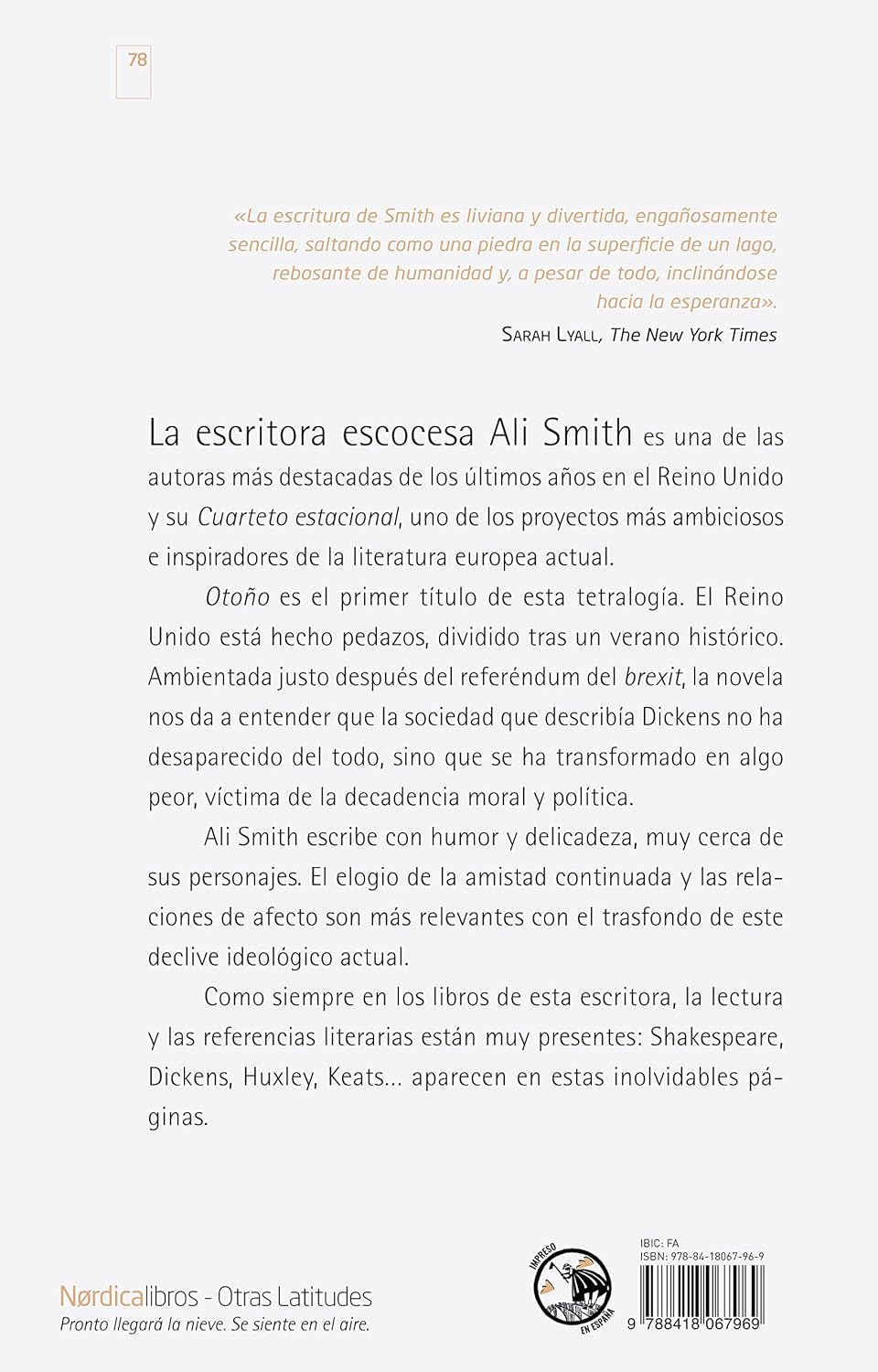 Premio Llibreter 2019 *N.º 2 de los Mejores Libros de Ficción del Año (El Cultural) *N.º 3 de los Mejores Libros de Ficción del Año (La Vanguardia) La primer novela del exitoso Cuarteto Estacional de Ali Smith es una meditación sobre un mundo cada vez más limitado y exclusivo, sobre la riqueza y el valor, sobre lo que significa la cosecha. Es la primera entrega de su cuarteto estacional: cuatro libros independientes, separados pero interconectados y cíclicos (como son las estaciones); y nos hace reflexionar sobre el propio tiempo. ¿Quiénes somos? ¿De qué estamos hechos? Esta es una novela sobre el envejecimiento y el tiempo y el amor y las historias mismas.
