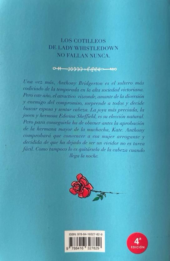 Los cotilleos de lady Whistledown no fallan nunca: una vez más, Anthony Bridgerton es el soltero más codiciado de la temporada en la alta sociedad victoriana. Pero este año, el atractivo  vizconde, amante de la diversión y enemigo del compromiso, sorprende a todos y decide buscar esposa y sentar cabeza. La joya más preciada, la joven y hermosa Edwina Sheffield, es su elección natural. Pero para conseguirla ha de obtener antes la aprobación de la hermana mayor de la muchacha, Kate. Anthony comprobará que convencer  a esa mujer arrogante y decidida de que ha dejado de ser un vividor no es tarea fácil. Como tampoco lo es quitársela de la cabeza cuando llega la noche.