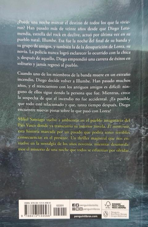 ¿Puede una noche marcar el destino de todos los que la vivieron? Han pasado más de veinte años desde que Diego Letamendia, estrella del rock en declive, actuó por última vez en su pueblo natal, Illumbe. Esa fue la noche del final de su banda y su grupo de amigos, y también la de la desaparición de Lorea, su novia. La policía nunca logró esclarecer lo ocurrido con la chica, que fue vista saliendo a toda prisa de la sala de conciertos, como si huyera de algo o de alguien. Después de aquello, Diego emprendió una carrera de éxitos en solitario y jamás regresó al pueblo.