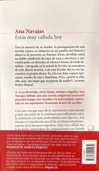 Ana Navajas nació en Buenos Aires en 1974 y estudió Ciencias de la Comunicación en la UBA. Es profesora de literatura creativa. Estás muy callada hoy es su primera novela, publicada originalmente en el sello Rosa Iceberg, fundado por Tamara Tenenbaum, Marina Yuszczuk y Emilia Erbetta, y en el que buscan dar lugar a escritoras noveles.