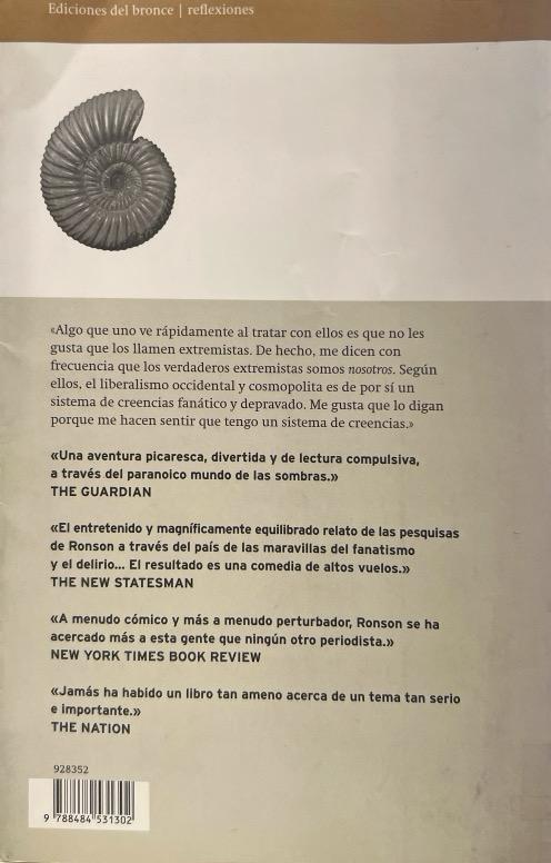 Cuando Jon Ronson se dedicó a investigar el universo paranoico de los extremismos más diversos, es decir, a los otros, descubrió que los enemigos de las democracias occidentales, desde los radicales islámicos hasta los neonazis, tiene algo en común: todos sostienen que la estructura cosmopolita y liberal de Occidente es un sistema fanático y degenerado, y que una reducida elite, reunida en la clandestinidad, decide el curso de los acontecimientos planetarios. La búsqueda de Ronson para dar con estos ocultos dirigentes del mundo resultó dificil y trepidante, pero muy divertida. Individuos con gafas oscuras lo persiguieron en Portugal; se descubrió que era judío en un campo de entrenamiento militar de la Yihad; escuchó a David Icke asegurar que en realidad lagartos de tres metros rigen nuestros destinos; tuvo que usar una caperuza del Ku Klux Klan; y presenció cómo varios políticos y empresarios de relevancia mundial -el grupo de Bilderberg- participaban en un extraño ritual en California.