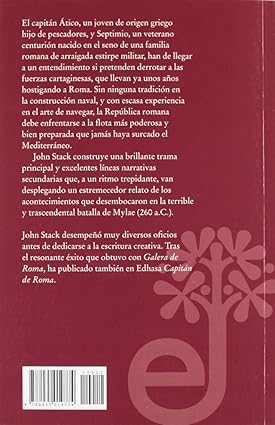 El capitán Ático, un joven de origen griego hijo de pescadores, y Septimio, un veterano centurión nacido en el seno de una familia romana de arraigada estirpe militar, han de llegar a un entendimiento si pretenden derrotar a las fuerzas cartaginesas, que llevan ya unos años hostigando a Roma. Sin ninguna tradición asentada en la construcción naval, y con una experiencia muy escasa en el arte de navegar, la República romana se enfrentaba a la flota más poderosa y bien preparada que jamás hubiera surcado el Mediterráneo. Sin embargo, tanto las convicciones y la educación recibida por Ático y Séptimus, como las endémicas luchas políticas que entorpecen cualquier decisión estratégica, no facilitarán en absoluto ese entendimiento. Combinando personajes ficticios con personajes y acontecimientos históricos, John Stack construye una poderosa trama principal y excelentes líneas narrativas secundarias que, a un ritmo trepidante, van desplegando un estremecedor relato de los acontecimientos que desembocaron en la terrible y trascendental batalla de Mylae (260 a.C.). Galera de Roma aúna los siempre gratificantes y curiosos relatos de la vida naval, que el autor conoce en profundidad, con una clara imagen de las luchas políticas de la época, y todo ello mostrado a partir de dos personajes tan entrañables y bien construidos como puedan serlo los de Simon Scarrow. El talento para recrear las batallas, la fuerza de los personajes y el poderoso realismo de John Stack le permitieron codearse ya con su primera novela con Harry Sidebottom, Bernard Cornwell y Simon Scarrow en las listas. Galera de Roma tiene todos los ingredientes para convertirse en un gran éxito.