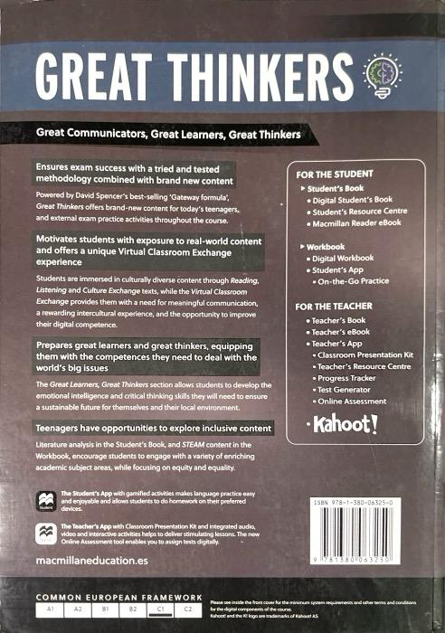 Great Thinkers es un método de inglés para secundaria con un enfoque en comunicación y pensamiento crítico. Cuaderno de actividades y versión digital, licencia válida durante 15 meses a partir de su activación. Acceso a la app del alumnado.