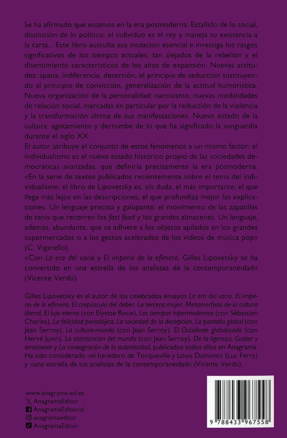 LA ERA DEL VACIO: ENSAYOS SOBRE EL INDIVIDUALISMO CONTEMPORANEO:-GILLES LIPOVETSKY 9788433967558 ANAGRAMA 2006 (USADO)