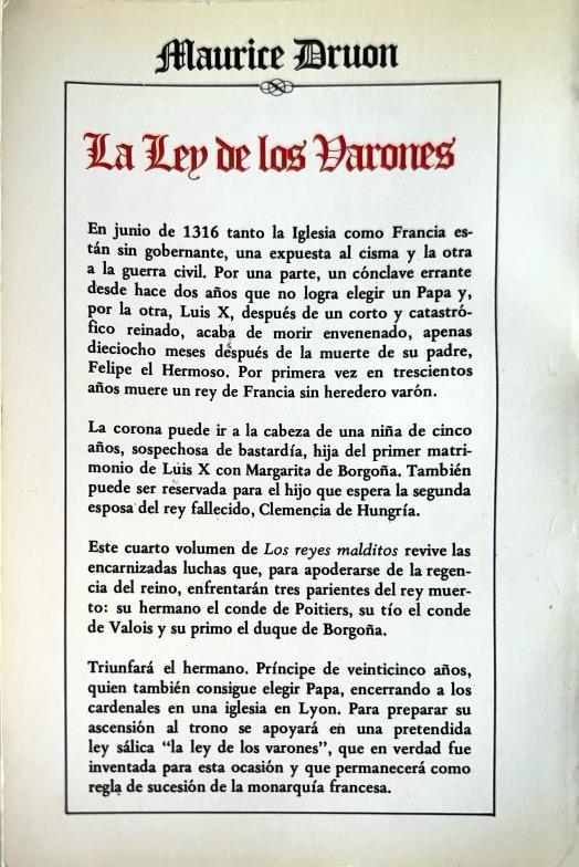 La corona puede ir a parar a la cabeza de una niña de cinco años, sospechosa de bastardía, hija del primer matrimonio de Luis X con Margarita de Borgoña. También puede ser destinada al hijo que espera la segunda esposa del rey fallecido, Clemencia de Hungría. Este cuarto volumen de la serie Los Reyes Malditos revive las luchas encarnizadas que, para apoderarse de la regencia, librarán tres parientes del rey muerto: su hermano el duque de Poitiers, si tío el conde de Valois, y su primo el duque de Borgoña.