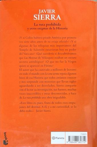 Javier Sierra, autor de éxito internacional, repasa algunos de los hitos de esa Historia que todos creíamos conocer y nos atrapa con misterios que llevan siglos aguardando a ser desvelados. Sierra comparte con el lector su investigación, sus fuentes, muchas veces inaccesibles y otras desconocidas, y hace de La ruta prohibida una obra inigualable.