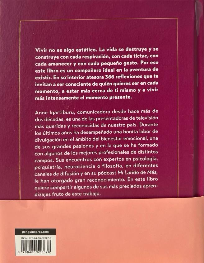 Anne Igartiburu, comunicadora desde hace más de dos décadas, es una de las presentadoras de televisión más queridas y reconocidas de nuestro país. Durante los últimos años ha desempeñado una bonita labor de divulgación en el ámbito del bienestar emocional, una de sus grandes pasiones y en la que se ha formado con algunos de los mejores profesionales de distintos campos. Sus encuentros con expertos en psicología, psiquiatría, neurociencia o filosofía en sus diferentes canales de difusión y en su Podcast Mi Latido de Más le han otorgado gran reconocimiento. En este libro quiere compartir algunos de sus más preciados aprendizajes fruto de este trabajo.