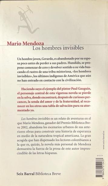 Los hombres invisibles es un relato de aventuras en el que Mario Mendoza, ganador del Premio Biblioteca Breve 2002, abandona los escenarios urbanos de sus anteriores obras para construir una historia de esperanza en medio de la naturaleza tropical americana. La gran acogida que han dispensado los lectores colombianos a la que es, quizás, la novela más personal de Mendoza demuestra la fuerza de la prosa de este autor imprescindible de las letras hispanas.