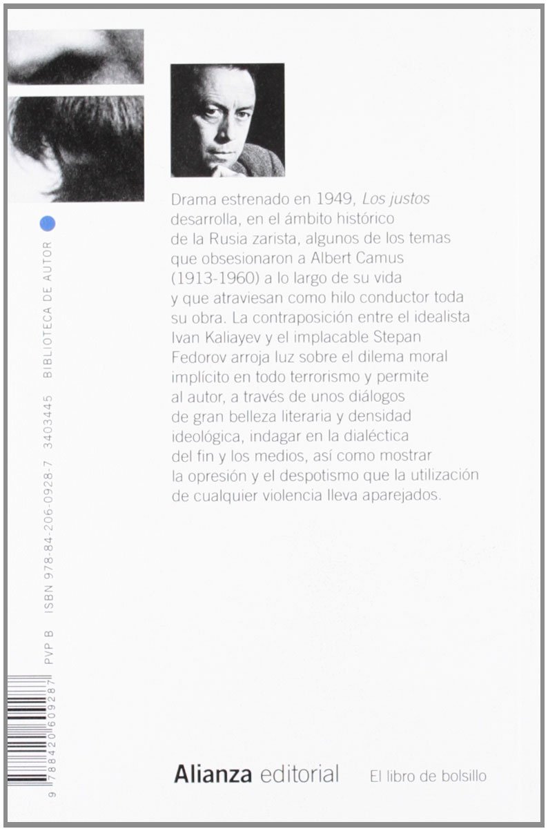 Drama estrenado en 1949, «Los justos» desarrolla, en el ámbito histórico de la Rusia zarista, algunos de los temas que obsesionaron a Albert Camus (1913-1960) a lo largo de su vida y que atraviesan como hilo conductor toda su obra. La contraposición entre el idealista Ivan Kaliayev y el implacable Stepan Fedorov arroja luz sobre el dilema moral implícito en todo terrorismo y permite al autor, a través de unos diálogos de gran belleza literaria y densidad ideológica, indagar en la dialéctica del fin y los medios, así como mostrar la opresión y el despotismo que la utilización de cualquier violencia lleva aparejados.
