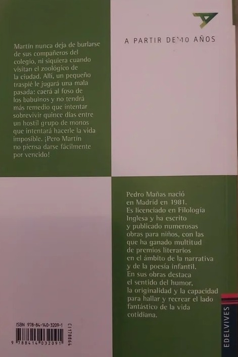 Martín nunca deja de burlarse de sus compañeros del colegio, ni siquiera cuando visitan el zoológico de la ciudad. Allí, un pequeño traspiés le jugará una mala pasada: caerá al foso de los babuinos y no tendrá más remedio que intentar sobrevivir quince días entre un hostil grupo de monos que intentará hacerle la vida imposible. ¡Pero Martín no piensa darse fácilmente por vencido!