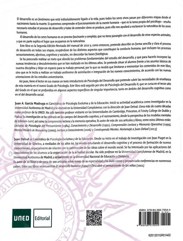 El desarrollo es un fenómeno que está indisolublemente ligado a la vida, pues todos los seres vivos pasan por diferentes etapas desde el nacimiento hasta la muerte. Si queremos comprender el funcionamiento de la mente humana que es la tarea propia del psicólogo resulta necesario estudiar el proceso de desarrollo y tratar de entender cómo se produce, pues ello nos ayudará a esclarecer la naturaleza de los seres humanos. El desarrollo de los seres humanos es un proceso fascinante y complejo, que no tiene parangón con el desarrollo de otras especies animales, y que en parte explica el lugar que ocupamos en la naturaleza. Este libro es la Segunda Edición Revisada del manual de 2010 y, como entonces, pretende describir en forma sencilla y clara el proceso de desarrollo en todas sus etapas, ocupándose de los distintos aspectos que constituyen la conducta humana, que incluyen los procesos sensoriomotores, afectivos, cognitivos y sociales, sin descuidar las bases fisiológicas. Se ha procurado realizar un texto que aborde los problemas fundamentales del estudio del desarrollo, y que para hacerlo incorpore las nuevas tendencias y descubrimientos que se han realizado en los últimos años. Se pretende situar al alumno frente a los asuntos básicos de nuestra disciplina y dejar un espacio para su trabajo personal, por lo que no tendrá que limitarse a memorizar los contenidos de este libro, sino que se le incita a realizar un trabajo autónomo de asimilación e integración de los nuevos conocimientos, de acuerdo con las nuevas orientaciones de los estudios universitarios. Así pues, tiene el lector en sus manos un texto introductorio de Psicología del Desarrollo que pretende cubrir las necesidades de enseñanza de esta materia en el nuevo Grado de Psicología. Este libro está seguido por otro de Psicología del Desarrollo II, que se cursa en el tercer año del Grado en el que se profundiza en algunos aspectos específicos de singular importancia, tanto en ámbito del desarrollo cognitivo como en el del desarrollo social.