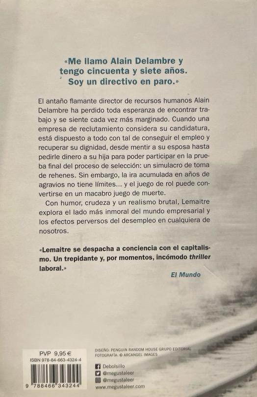 TRADUCIDO A 14 IDIOMASCon humor, crudeza y un realismo brutal, Lemaitre explora el lado más inmoral del mundo empresarial y los efectos perversos que el desempleo puede llegar a tener en cualquiera de nosotros.«Me llamo Alain Delambre y tengo cincuenta y siete años. Soy un directivo en paro.»