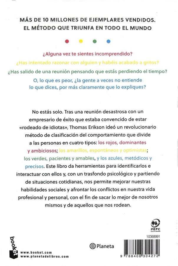 No estás solo. Tras una reunión desastrosa con un empresario de éxito que estaba convencido de estar «rodeado de idiotas», Thomas Erikson ideó un revolucionario método de clasificación del comportamiento que divide a las personas en cuatro tipos: los rojos, dominantes y ambiciosos; los amarillos, espontáneos y optimistas; los verdes, pacientes y amables, y los azules, metódicos y precisos. Este libro da herramientas para identificarlos e interactuar con ellos y, con un trasfondo psicológico y partiendo de situaciones cotidianas, nos permite mejorar nuestras habilidades sociales y afrontar los conflictos en nuestra vida profesional y personal, con el fin de sacar lo mejor de nosotros mismos y de aquellos que nos rodean.