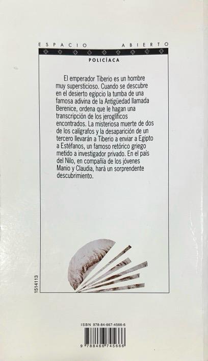 El emperador Tiberio es un hombre muy supersticioso. Cuando se descubre en el desierto egipcio la tumba de una famosa adivina de la antigüedad llamada Berenice, ordena que le hagan una transcripción de los jeroglíficos encontrados. La misteriosa muerte de dos de los paleógrafos y la desaparición de un tercero llevarán a Tiberio a enviar a Egipto a Estéfanos, un famoso retórico griego metido a investigador privado. En el país del Nilo, en compañía de los jóvenes Manio y Claudia, hará un sorprendente descubrimiento.