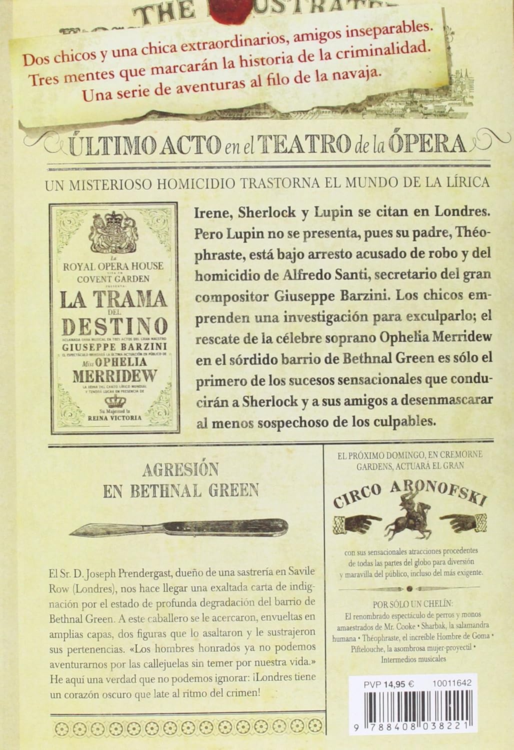 ✅-Los chicos emprenden una investigación para exculparlo; el rescate de la célebre soprano Ophelia Merridew en el sórdido barrio de Bethnal Green es sólo el primero de los sucesos sensacionales que conducirán a Sherlock y sus amigos a desenmascarar al menos sospechoso de los culpables.