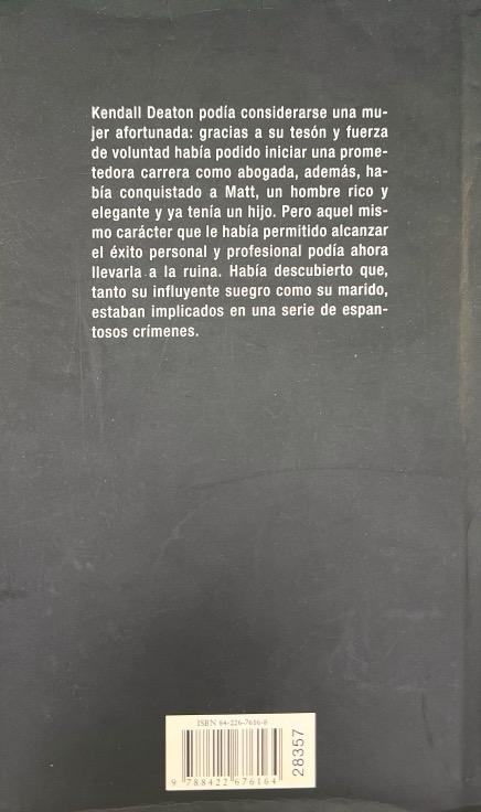 Tras sufrir un accidente automovilístico, Kendall Deaton logra rescatar a su hijo del amasijo de hierros y escalar el barranco por el que se han precipitado. Al llegar al hospital, no se atreve a revelar su propia identidad ni la del conductor herido; se limita a decir que se trata de su marido y, en cuanto puede, comienza a planear la huida. La pesadilla de Kendall comenzó en un pequeña localidad de Carolina del Sur, adonde llegó dispuesta a convertirse en la mejor abogada de oficio del condado. Enseguida se enamoró de un rico y attractivo joven de la localidad, y a los pocos meses de noviazgo se celebró una boda digna de un cuento de hadas. Pero jamás imaginó que se vería envuelta en una aterradora trama de odio y fanatismo.