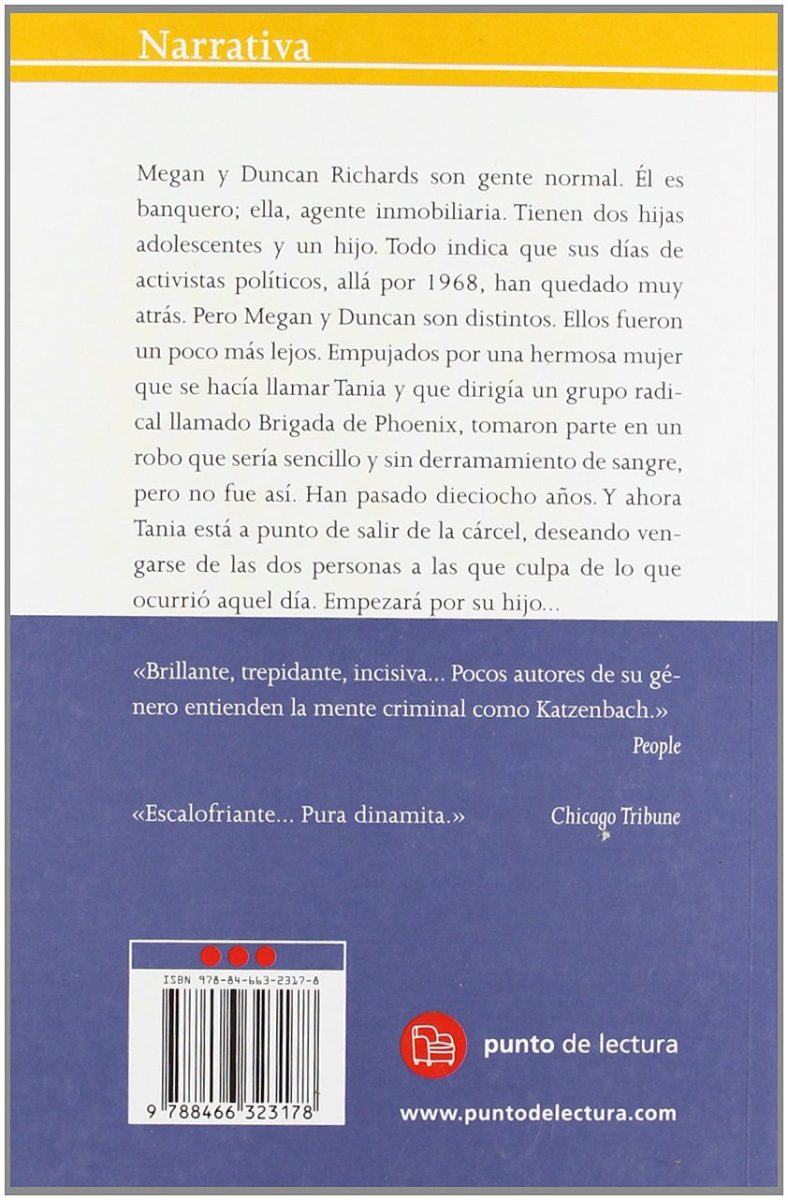 Megan y Duncan Richards son gente normal. Él es banquero; ella, agente inmobiliaria. Tienen dos hijas adolescentes y un hijo. Todo indica que sus días de activistas políticos, allá por 1968, han quedado muy atrás. Pero Megan y Duncan son distintos. Ellos fueron un poco más lejos. Empujados por una hermosa mujer que se hacía llamar Tania y que dirigía un grupo radical llamado Brigada de Phoenix, tomaron parte en un robo que sería sencillo y sin derramamiento de sangre, pero no fue así. Han pasado dieciocho años. Y ahora Tania está a punto de salir de la cárcel, deseando vengarse de las dos personas a las que culpa de lo que ocurrió aquel día. Empezará por su hijo… «Brillante, trepidante, incisiva… Pocos autores de su género entienden la mente criminal como Katzenbach.» People «Escalofriante… Pura dinamita.» Chicago Tribune