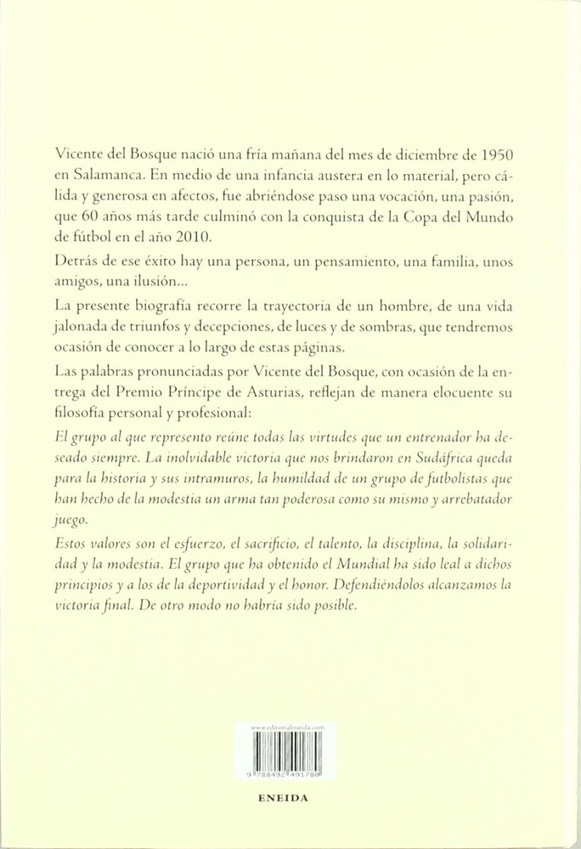 Publicada por Editorial Eneida, la biografía autorizada de Vicente del Bosque está ilustrada con más de 90 fotografías. Un hermoso y detallado recorrido por la vida de Vicente del Bosque, que hará que el lector conozca mejor a la figura y al personaje español más importante e internacional del año 2010. Paso a paso, acontecimiento a acontecimiento, Vicente del Bosque, El triunfo de los valores, repasa la existencia del entrenador de la Selección Española: su infancia, sus comienzos en el mundo del fútbol, su exitosa carrera deportiva, sus lesiones, su etapa como entrenador del Real Madrid, su tarea como entrenador de la Selección, la consecución del hito deportivo más importante del fútbol español, en definitiva, los éxitos y las decepciones, las luces y las sombras de la vida de una de las personas más queridas y admiradas de nuestro país.